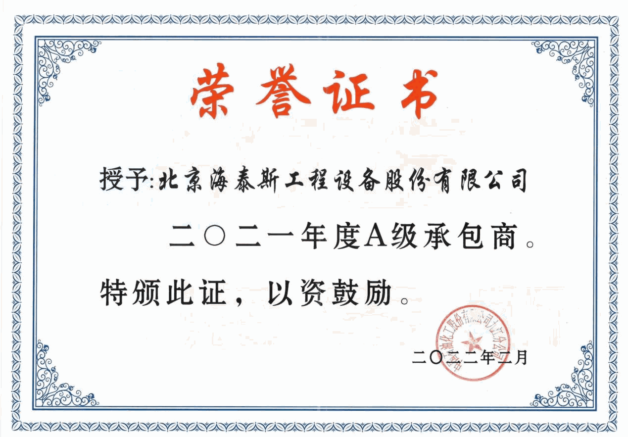 海泰斯為優(yōu)質(zhì)客戶提供的法蘭連接密封完整性管理方案及工程技術服務, 被授予“二0二一年度A級承包商”榮譽稱號。